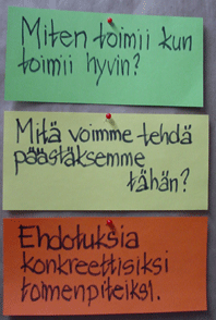 Kuvassa esimerkki Metaplan- korteille kirjoitetusta jalostusvaiheen ohjeistuksesta. |