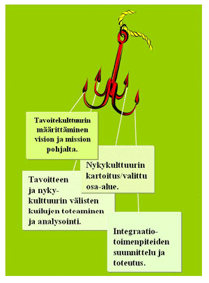 1. Pyydetään johtoa (usein johtoryhmä) määrittelemään vision ja strategian pohjalta yrityksen tavoitekulttuuri. Tämä määritys tapahtuu verkkopohjaisessa versiossa siten että johto vastaa joukkoon kysymyksiä koskien muun muassa eri yksikköjen välisiä toivottuja kulttuurin yhtäläisyyksiä ja erilaisuuksia. DocSort versiossa tehdään valintoja havaittaviissa olevista toivotuista kulttuuripiirteistä. Molemmissa tapauksissa syntyy kuuden ulottuvuuden kulttuuriprofiili.