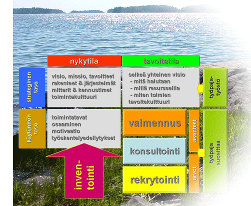 - Käytännön tasolla nyky- ja tavoitetilan kartoitus - inventoidaan tarpeelliset elementit